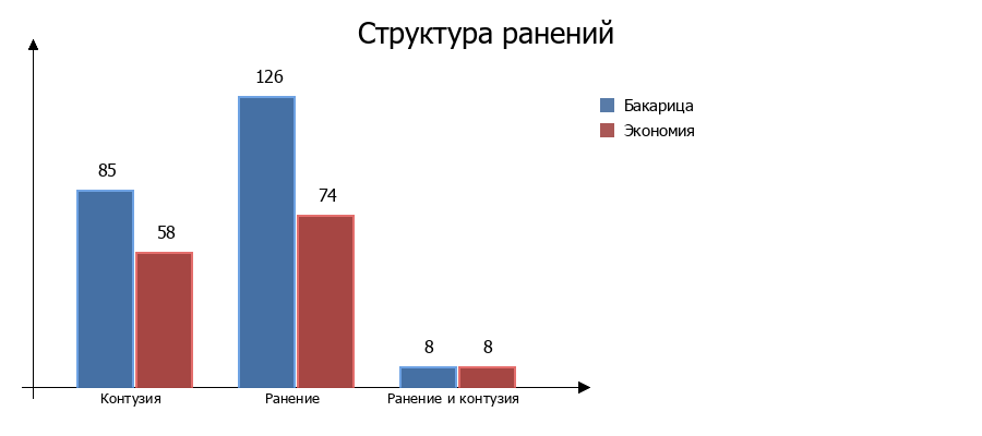 Экономия. Общее количество раненых указывается в отчёте и телеграммах с мест от указанных дат. На этом и следующем графике обращает на себя внимание почти одинаковый наклон графика, показывающий то, как происходила выписка пострадавших. К сожалению, график поступления пострадавших на Бакарице может быть построен только начиная с 27 октября. Равный наклон может говорить и о сходстве характера поражений при обоих событиях.