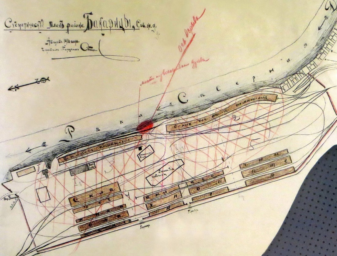 26-27 октября 1916 года. Бакарица — портовый район Архангельска, крупнейшего и единственного порта, принимавшего вооружение, ввозимое из Америки и Европы. Береговая линия: 21 причальное место (26 по проекту). Мощность на пропуск: 220 000 тонн грузов в месяц (иными словами: неограниченно).