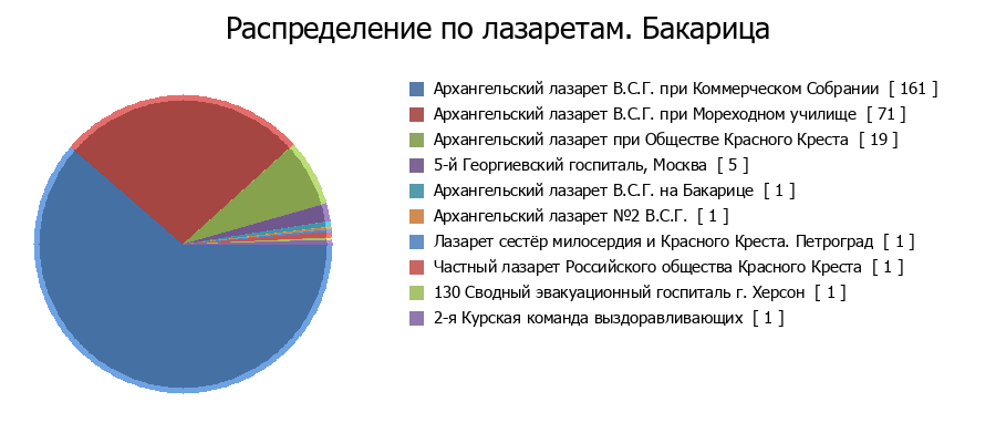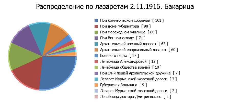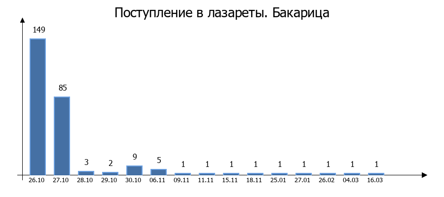 Бакарица. На диаграмме показано распределение пострадавших по лазаретам за весь период. Данные неполные, составлены по лазаретным карточкам. Этот и следующий за ним графики — демонстрация того, как не должен выглядеть маневр коечным фондом лазаретов.