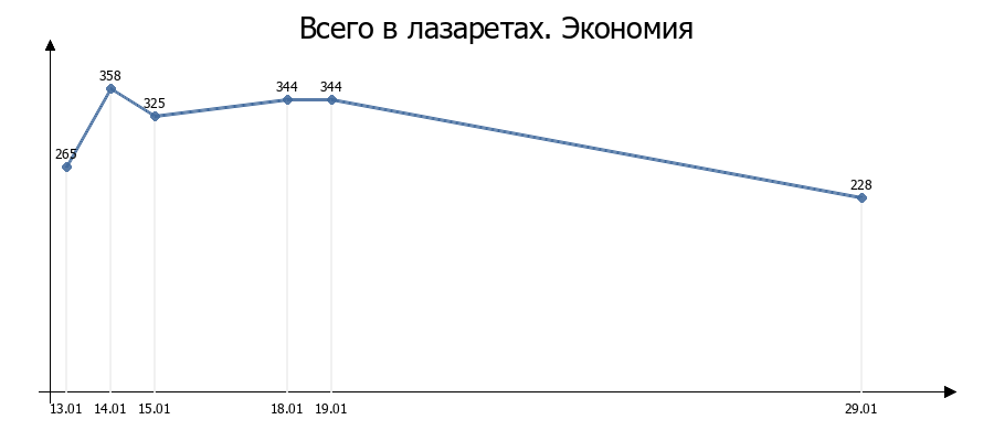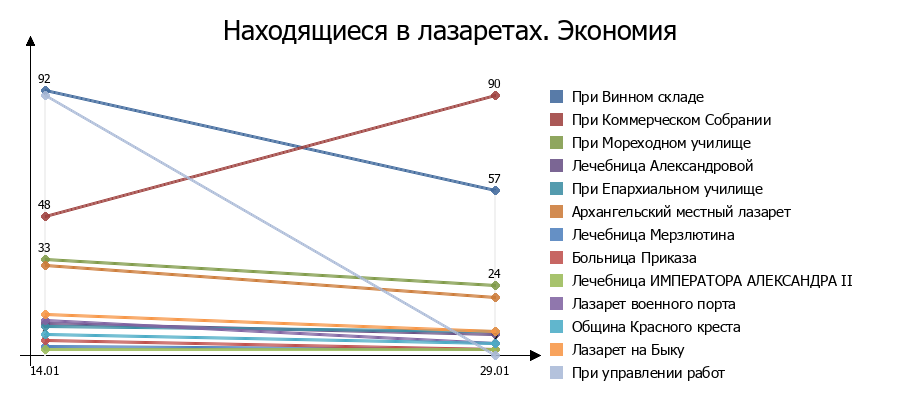 Экономия. Нагрузка на лазареты. Обнаруженные официальные отчёты о числе пострадавших, остающихся в лазаретах, содержат всего 2 контрольные точки: 14 и 29 января 1917 г. Так выглядит перемещение из локального лазарета при порте (где производится сортировка и маршрутизация) в лечебные заведения города.