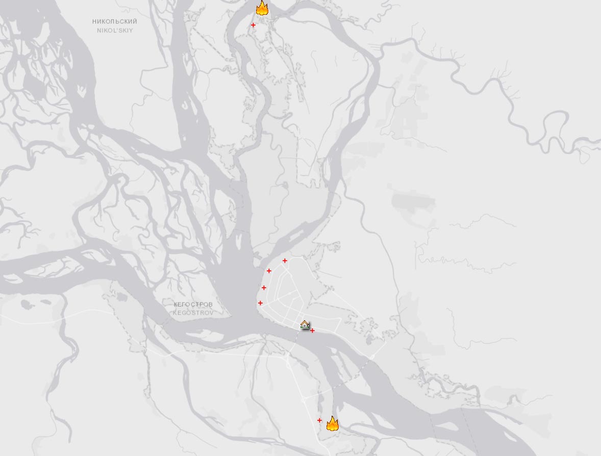 План размещения объектов. Красными крестами показано приблизительное расположение лазаретов. Иконка дома указывает на расположение координирующего центра Порта. Иконки пожаров — места событий.